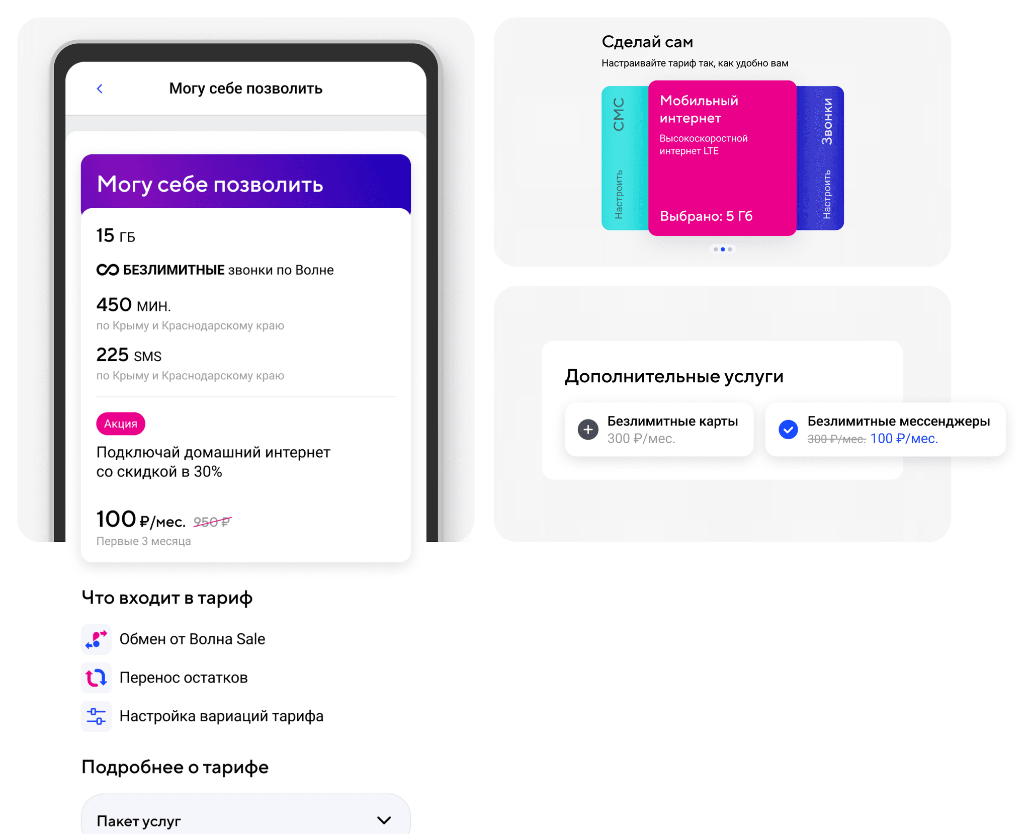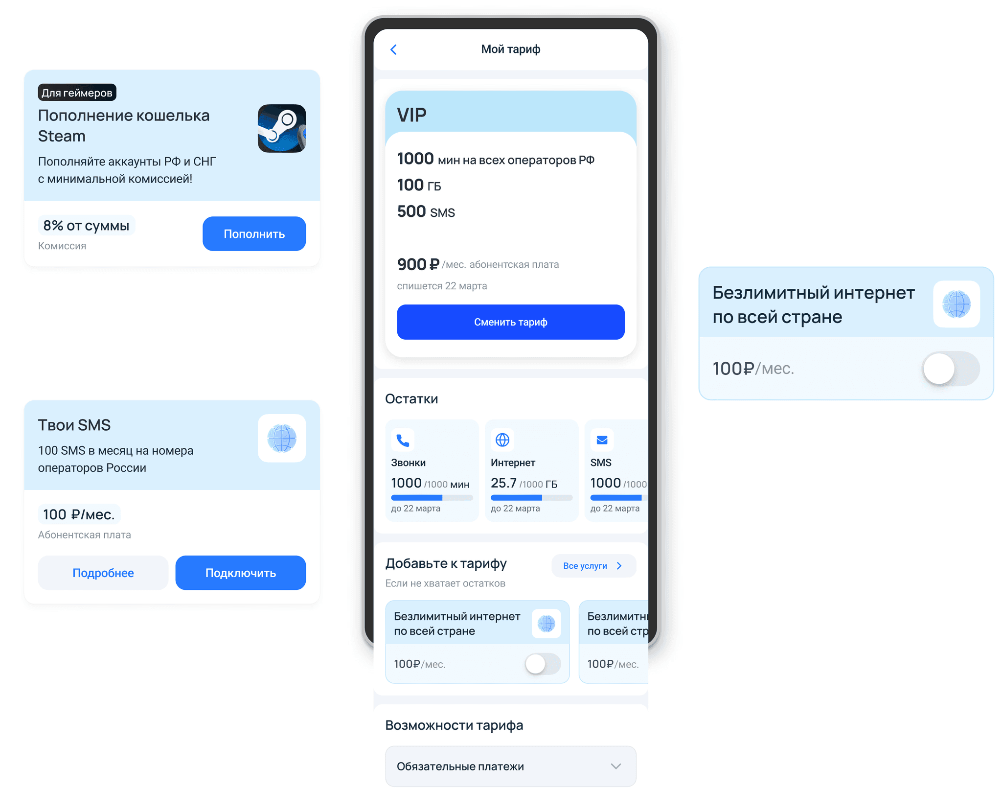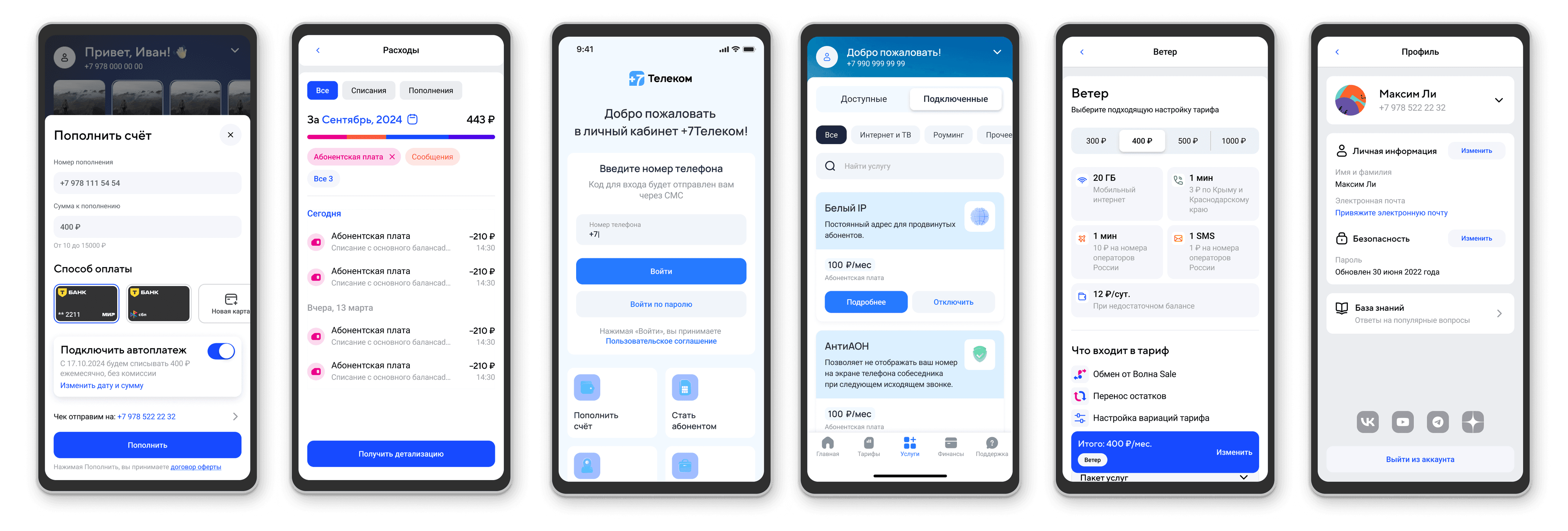 Мы внедрили бесшовную авторизацию, объединив два бренда в единую систему входа без дополнительных шагов. Полностью переработали главный экран — он адаптируется под фичи и продукты каждого бренда. Обновили карточки тарифов: теперь пользователь сразу видит ключевую информацию и может легко управлять своим тарифом. Навигация стала чище, логичнее и более интуитивной